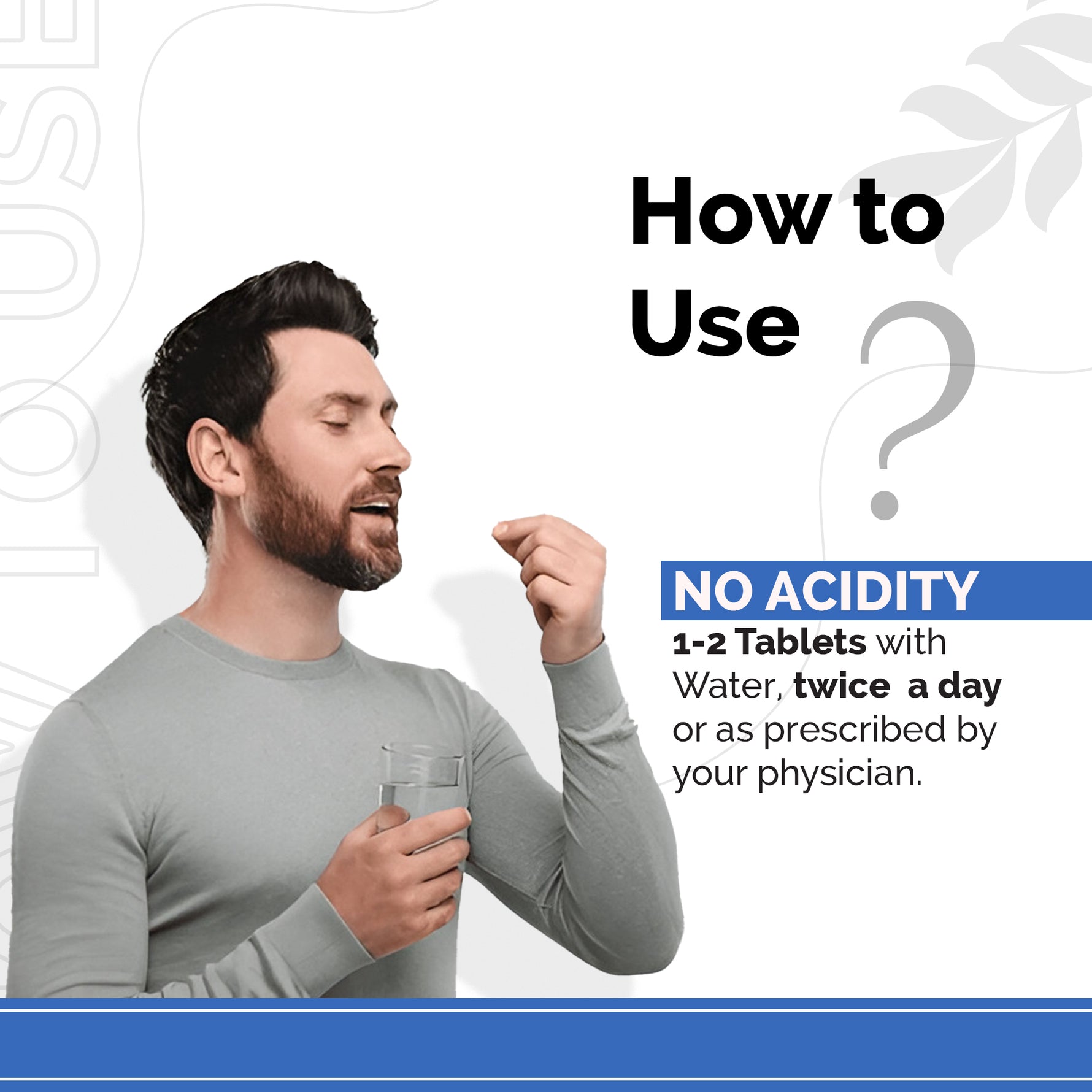 1-2 Tablet with water twice a day or as prescribed by your physician. Consult a health professional if you have any underlying health issues, allergies and incase of pregnancy and lactation. Individual Results May Vary. Effectiveness depends on various factors, including health and lifestyle.